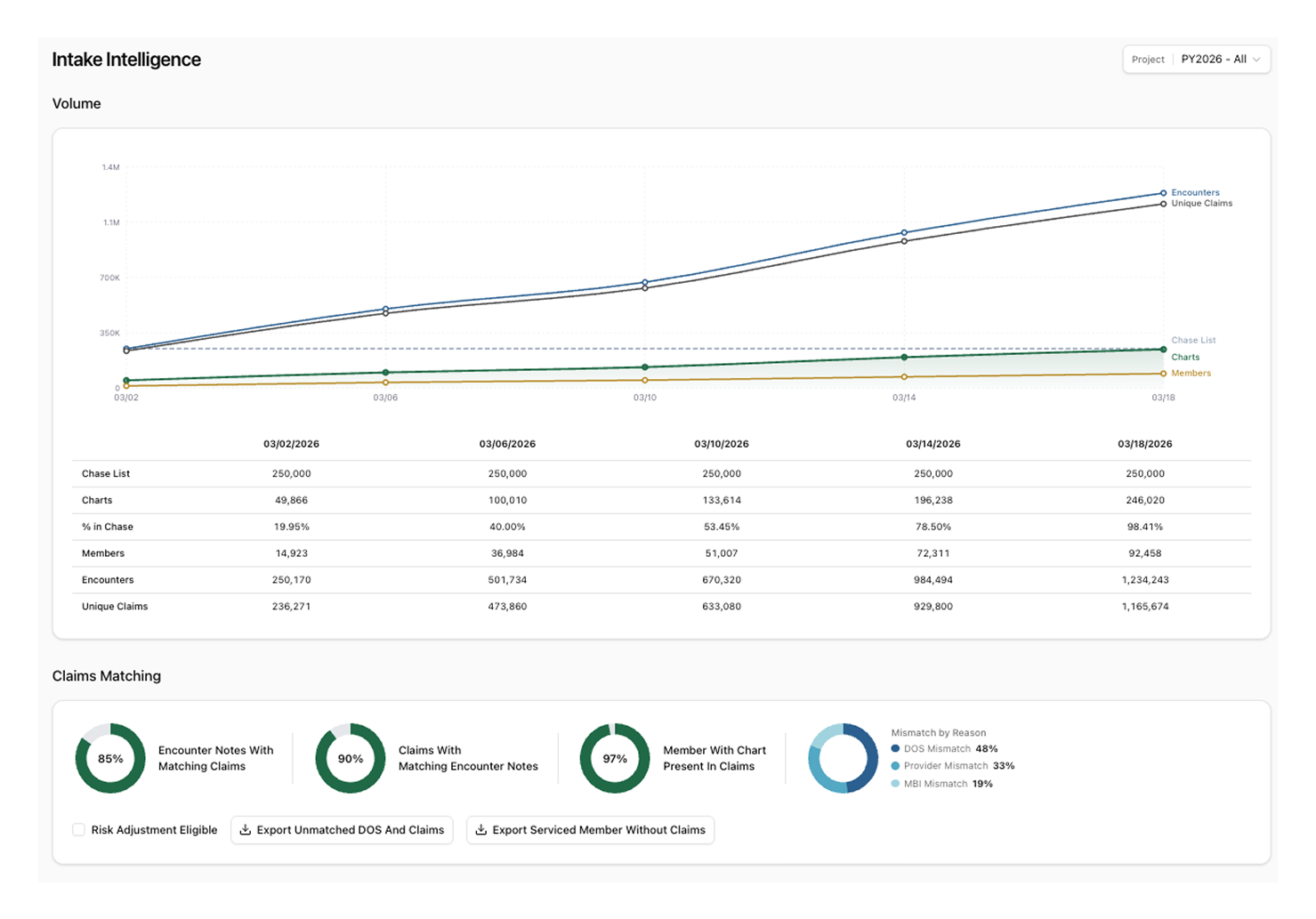The Claims Intelligence dashboard allows risk adjustment and Medicare Advantage program administrators to view key statistics about the review underway, including: